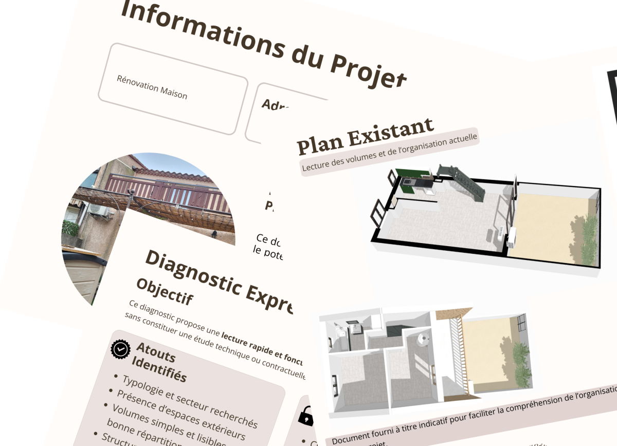 La Projection d’Aménagement & Estimation (PAE) est une méthode que j’ai développée pour permettre une compréhension claire et complète d’un habitat avant de s’engager. Elle combine :